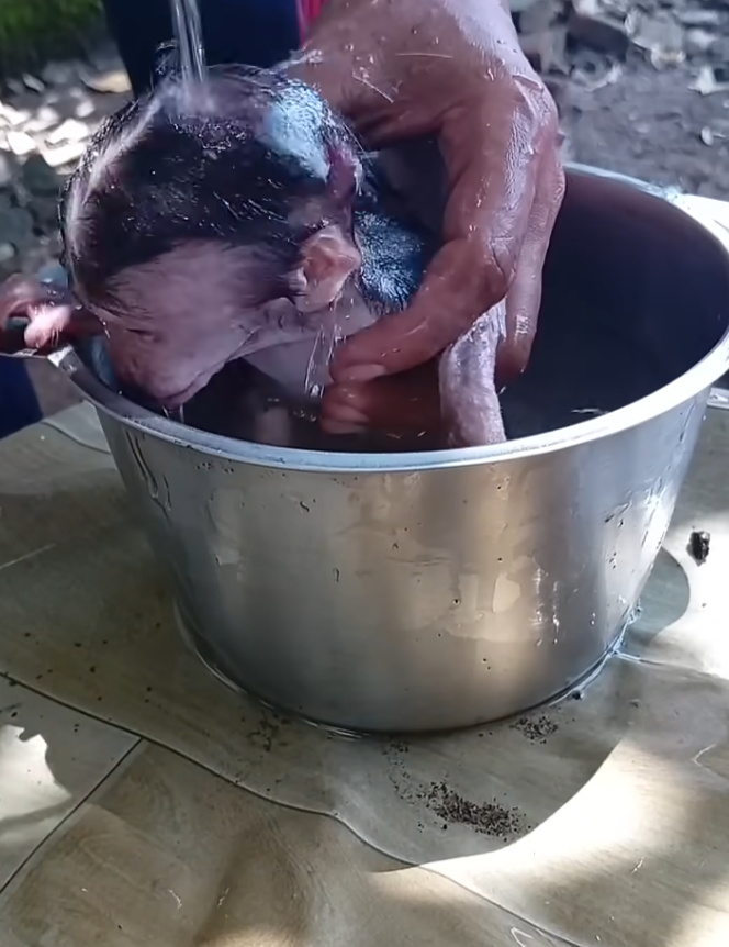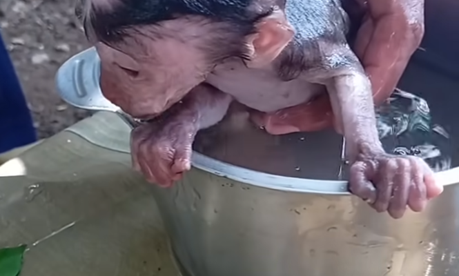 The baby monkey grew calmer as the bath continued. His splashing slowed. His movements softened. The cool water had done its work, washing away not only dirt but the tired fussiness that clung to him after a long day. He yawned, wide and slow, showing tiny teeth that barely seemed real.