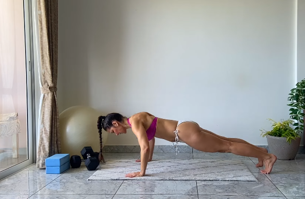 This move is brutal right from the start. It targets your chest, shoulders, triceps, core, glutes, and quads—while also spiking your heart rate.