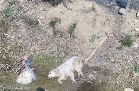 The mama dog lay trembling, eyes wide, watching him. She tried to stand but collapsed again, letting out another desperate cry.
