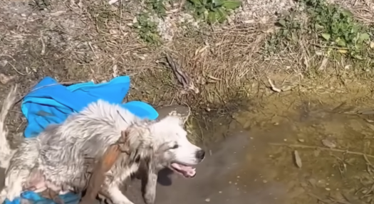 As soon as the puppies were placed on dry ground, the mama dog tried to crawl toward them. She cried softly, stretching her neck as far as she could.