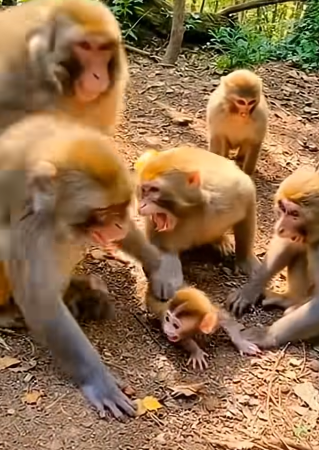 The troop closed ranks. Larger monkeys positioned themselves above and around the young one, shaking branches, baring teeth, lunging downward in warning. Their cries echoed through the forest, layered and powerful.
