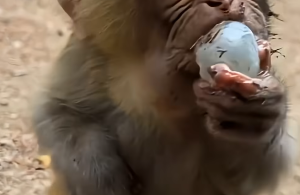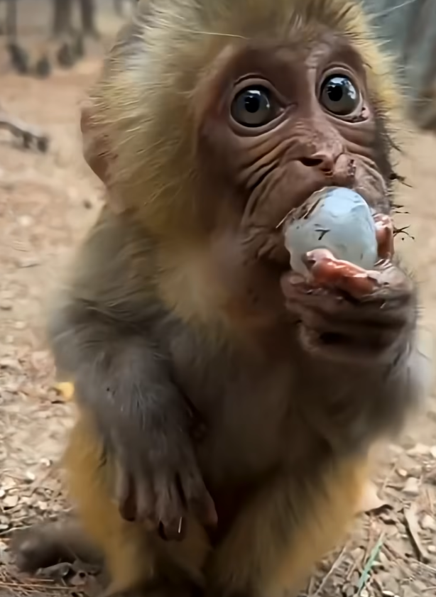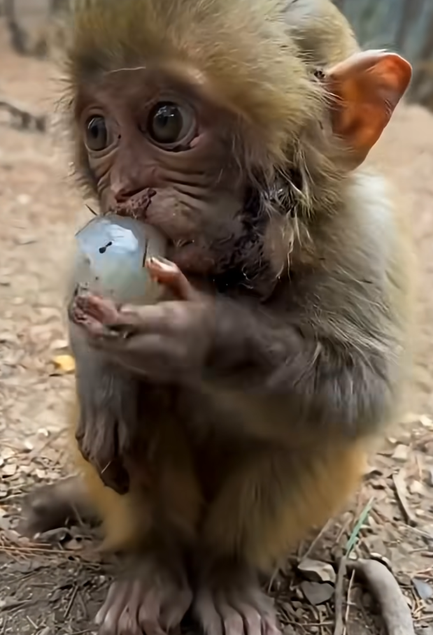 The baby monkey’s tiny hands grew sticky as he continued nibbling. He tried to rotate the fruit, searching for softer spots. Sometimes he bit too hard and pulled away suddenly. Other times he managed a perfect small bite and chewed proudly.