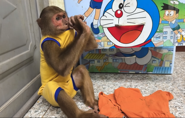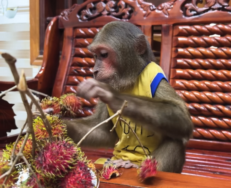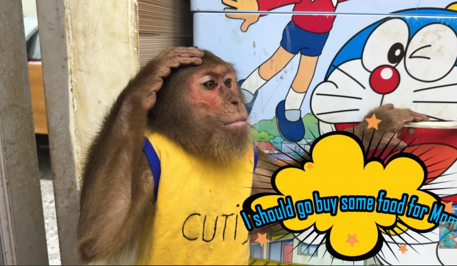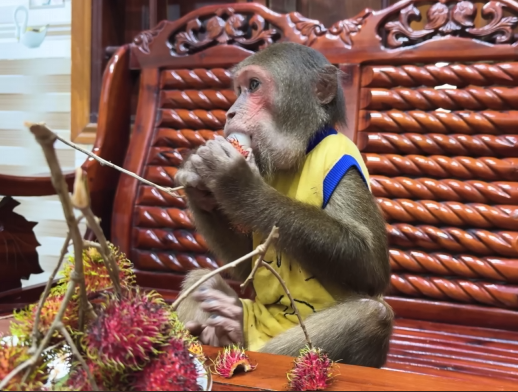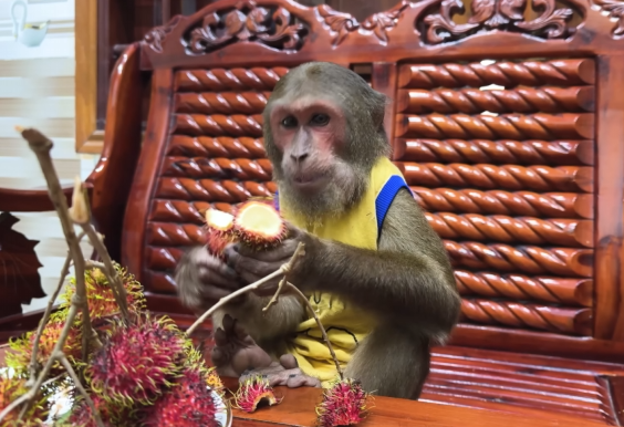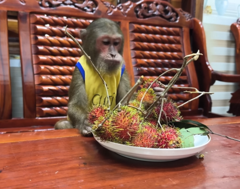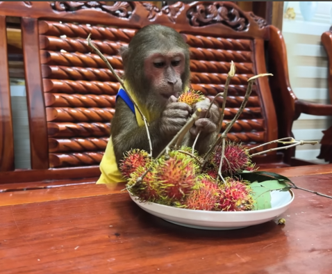But CUTIS didn’t stop there. She knew her mother would be too tired to peel and prepare the bananas herself. So, with the baby monkey’s help, she began to carefully wash, peel, and slice the fruit. She arranged it on a small plate with delicate attention, making sure it looked appealing and easy to eat. The baby monkey even carried a few slices over to her mother’s resting spot, offering them with tiny, eager hands.