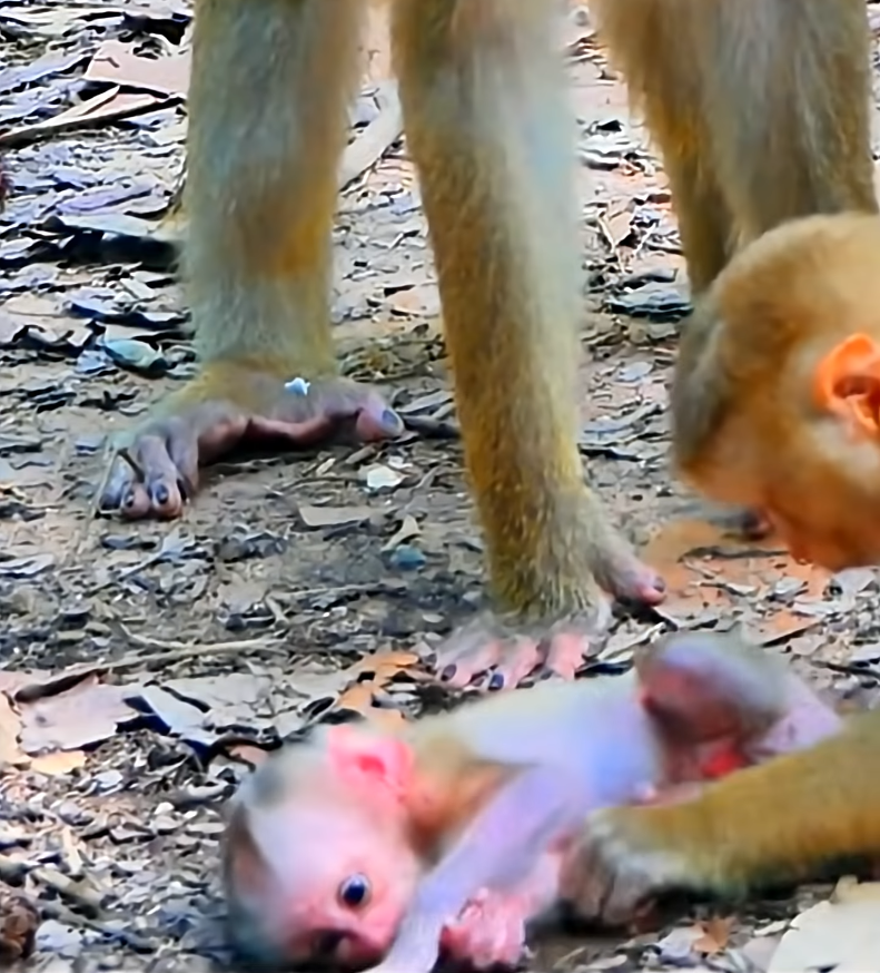 The baby clung weakly to a low branch, its tiny fingers trembling as tears welled in its wide, dark eyes. Its cry was not the playful squeak of a youngster seeking attention; it was raw and urgent, filled with confusion and fear. Just below, its mother stood on the forest floor, alert and tense. Instead of scooping the baby into her arms as she usually did, she reached up, gently but firmly grasped its small foot, and began to move away.