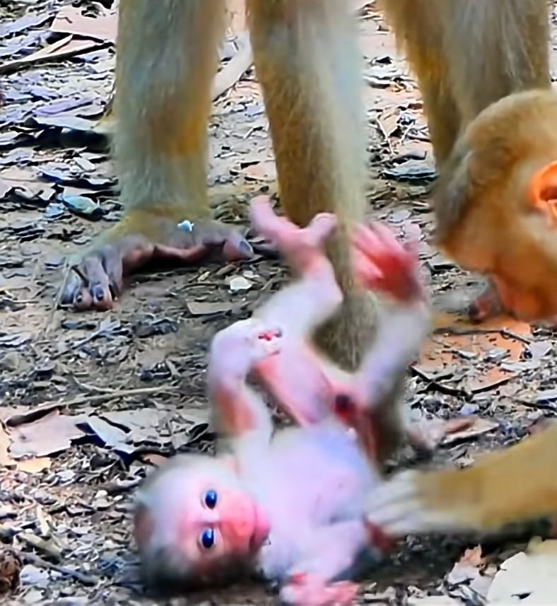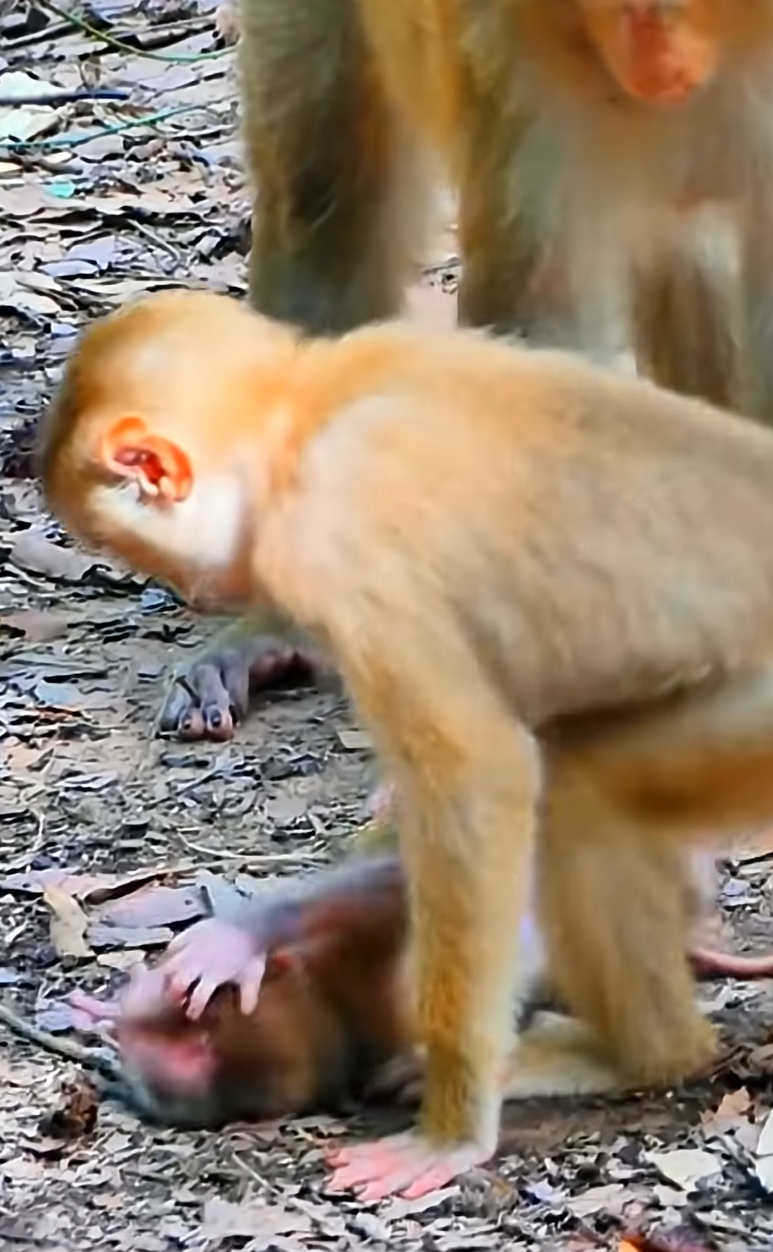 In the quiet green depths of the forest, where sunlight filtered through layers of leaves and painted the ground in shifting patterns, life moved to rhythms older than memory. The air carried the sounds of rustling branches, distant bird calls, and the soft chatter of monkeys leaping from tree to tree. Among them lived a small troop whose days were filled with foraging, grooming, and watchful care. Yet on this particular morning, an unusual cry echoed through the canopy — the thin, trembling wail of a baby monkey in distress.