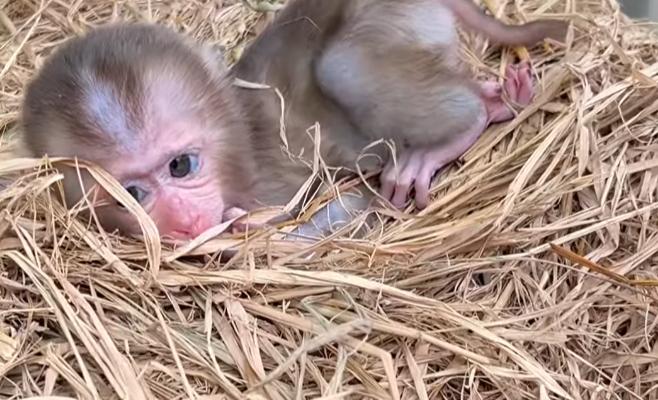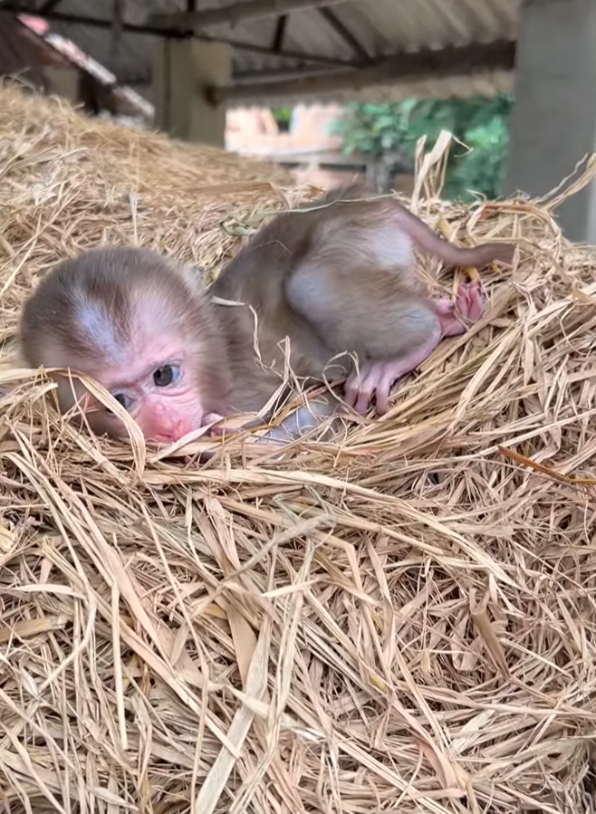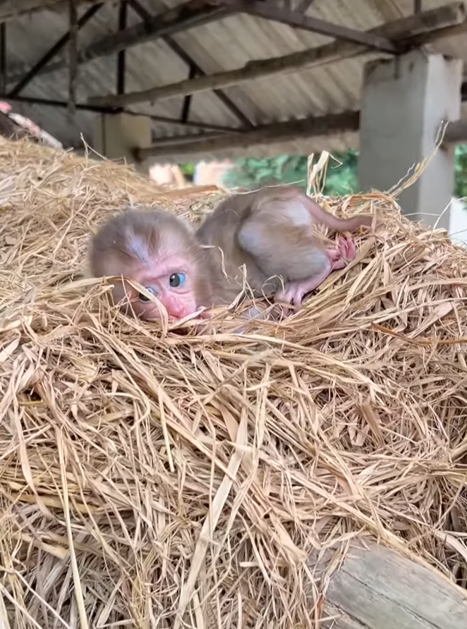 The little monkey’s fur blended softly with the pale straw. His small hands were folded on his chest, and his bright eyes stared upward at the endless blue sky. Every now and then, a light breeze would pass through, rustling the hay and lifting a few strands into the air. But he didn’t move much. He seemed lost in thought about something—something only he could understand.
