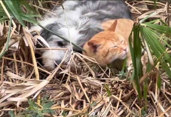 Over the first few days, it became painfully clear that these animals had been abandoned. Their fur was matted in places, the dog’s eyes showed signs of fatigue, and the cat’s delicate frame had lost some of its usual sleekness. Hunger and thirst were evident — their bodies moved slower, they shared food scraps from neighbors whenever available, and the cat’s usual grace was subdued by exhaustion.