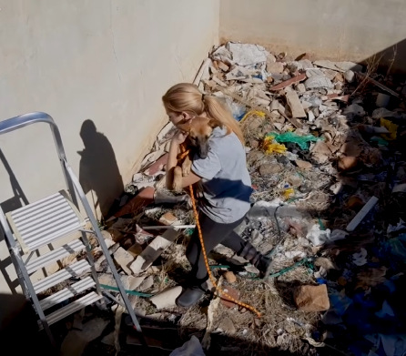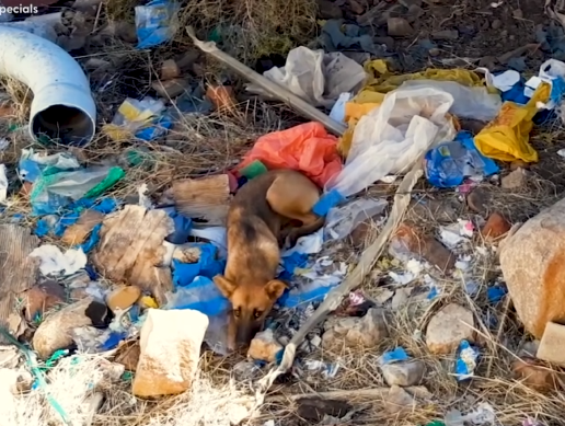 Inside, among crumpled takeout containers and discarded cardboard, was a small dog.