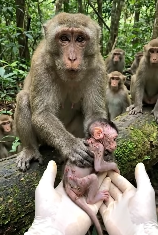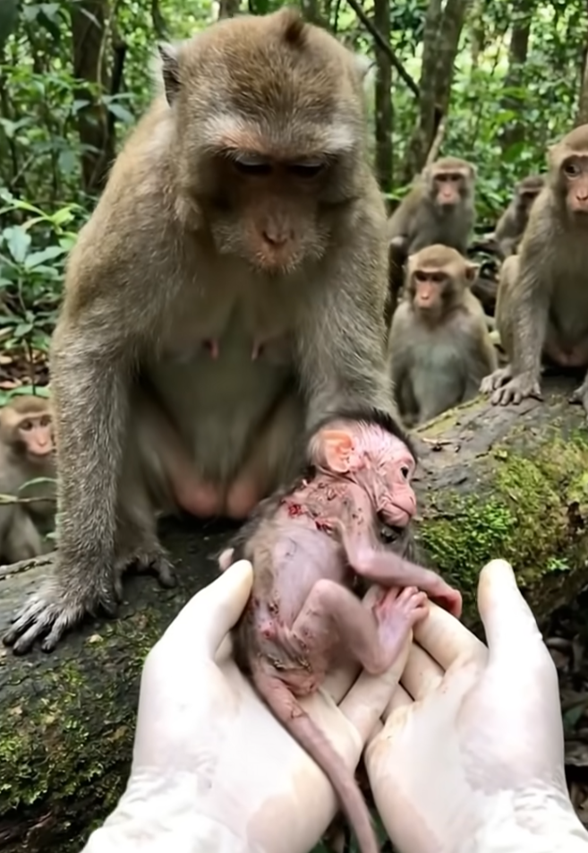 A mother monkey clutched her baby tightly against her chest. Her eyes were wide with fear, and her body trembled—not from cold, but from panic. The tiny infant in her arms was weak. Too weak.