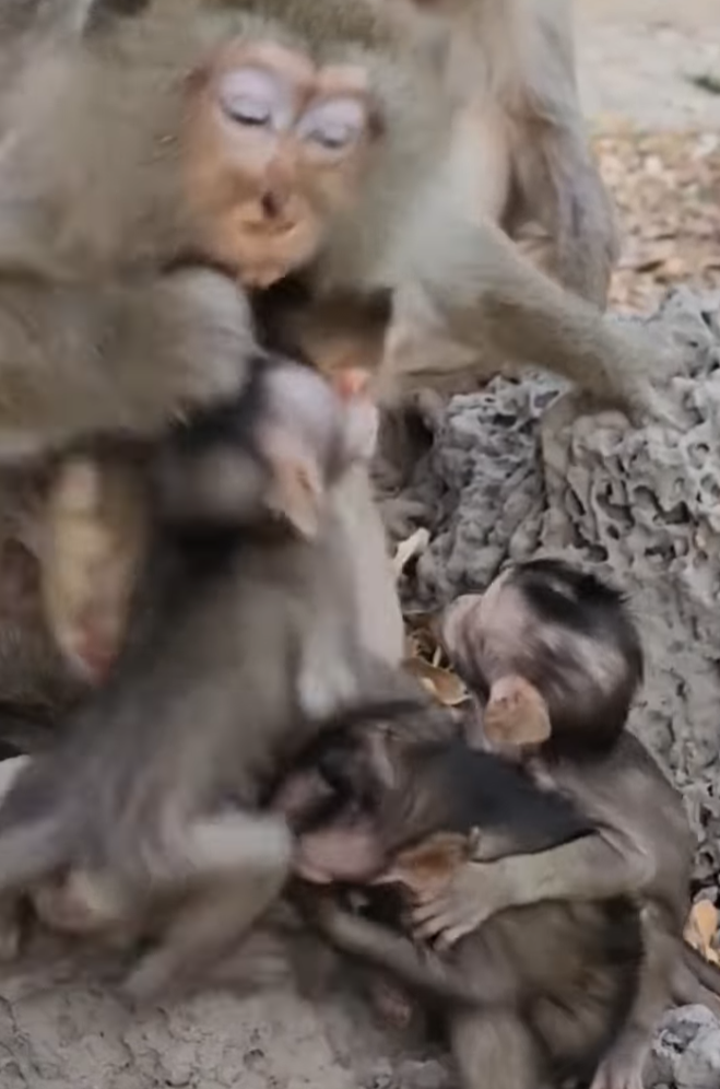 They nipped at each other’s fur—not hard enough to wound, but sharp enough to warn. Tiny hands pushed and grabbed. Tails whipped through the air. One monkey climbed higher and jumped down dramatically onto the others, as if declaring himself the winner.