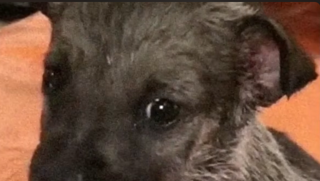 A tiny puppy crouched near a pile of broken bricks, his body pressed low, trembling uncontrollably. His fur was patchy and caked with dirt, and one eye was swollen nearly shut. Small rocks lay scattered around him, some still rolling to a stop.