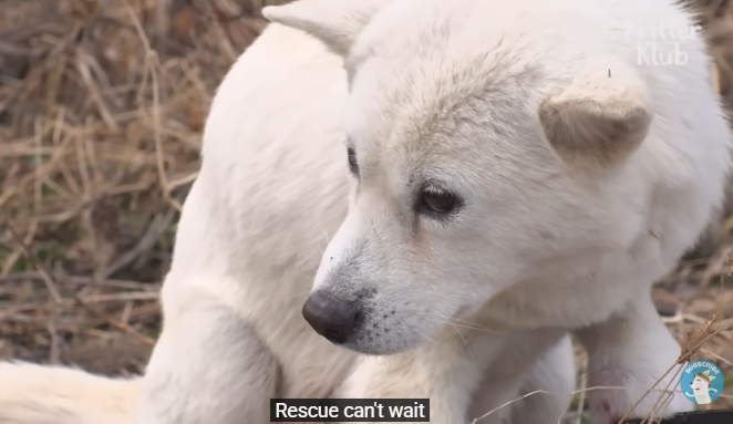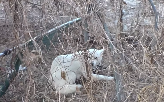 A brown and white dog lay partially hidden among dry leaves, her body tense, eyes wide with pain and fear. One of her front legs was caught in a rusted hunting trap, the metal jaws clamped tightly around her limb. The chain was anchored to a thick root, giving her only a few feet of movement.