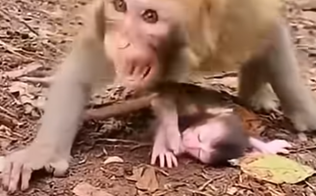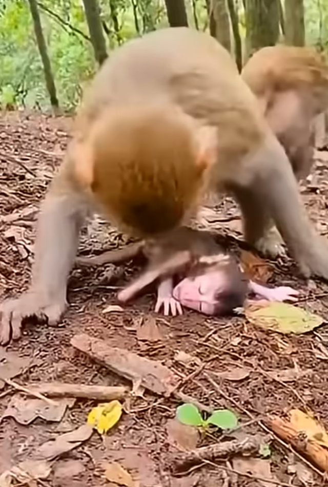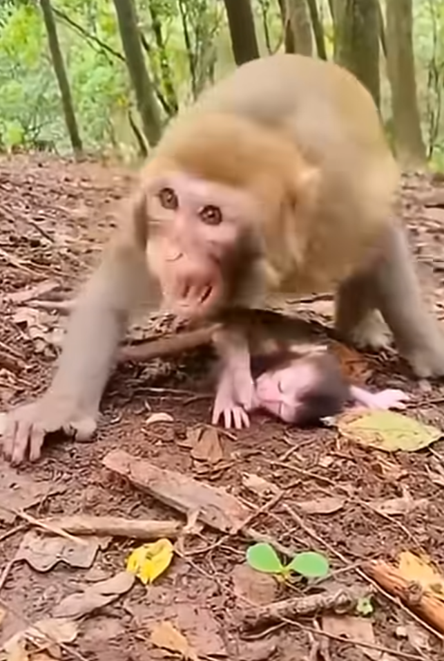 The mother rushed forward, her breathing rapid, her hands trembling as she scooped him into her arms. She turned him over and over, checking his limbs, his head, his tiny ribs. Her grooming became frantic—licking his face, brushing dirt from his fur, nudging him repeatedly.
