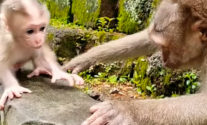 Near the edge of the group, a baby monkey attempted to join the older juveniles. He waddled forward with determination, his steps unsteady but brave. When one older monkey noticed him, she softened her play immediately. Instead of jumping away at full speed, she crouched low and allowed him to tug gently at her tail.