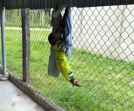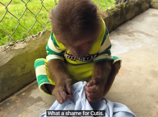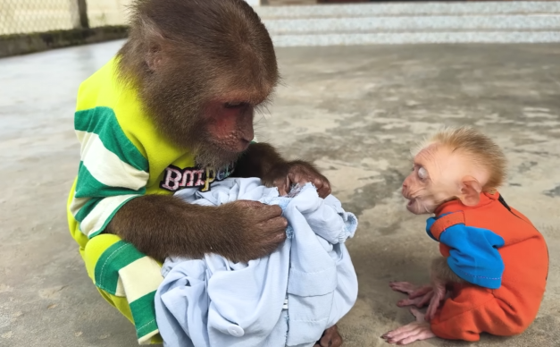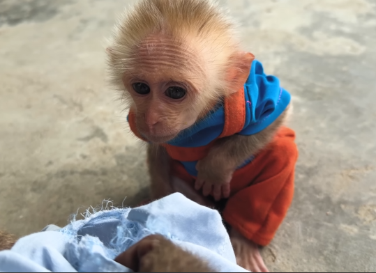 The little monkey had been unusually curious lately. His bright eyes followed Mom everywhere, especially now that her routine had changed. He seemed fascinated by the soft piles of maternity clothes folded neatly in a basket near the bedroom — loose dresses, cozy sweaters, and soft fabrics that smelled faintly like lavender.