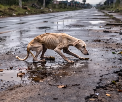 It was a dog — little more than skin and bones — dragging himself across the wet pavement. His fur, once perhaps soft and golden, now clung to his fragile body in muddy clumps. Each movement looked like an impossible effort, as though even lifting a paw required more strength than he had left.