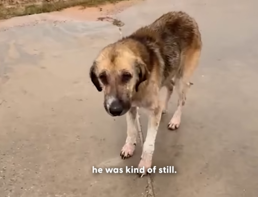 As they approached, the dog flinched at first. His ears flattened. His body stiffened.