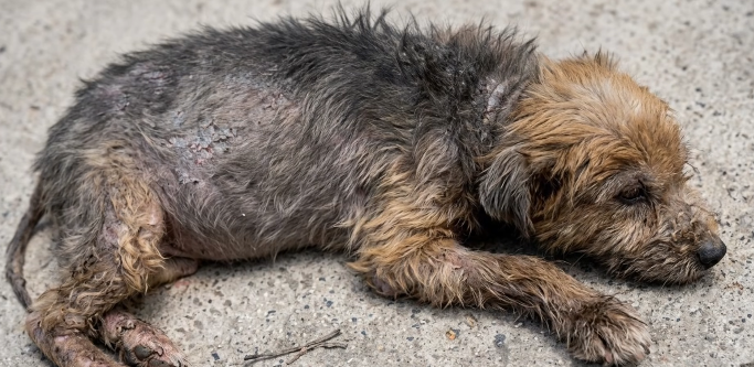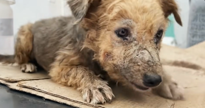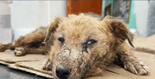 The dog looked at her with wide, frightened eyes. His body shook, but he didn’t try to run away. It was as if he was too exhausted to move any further.