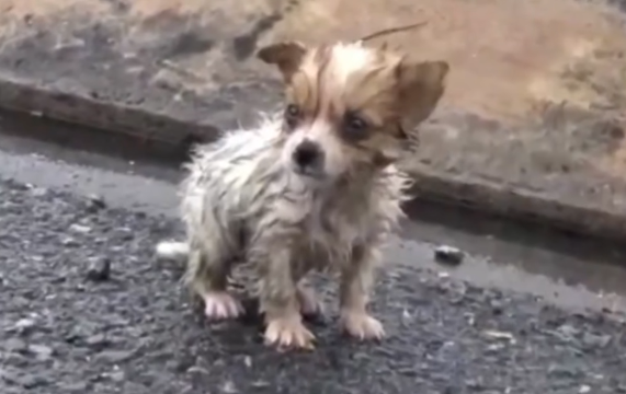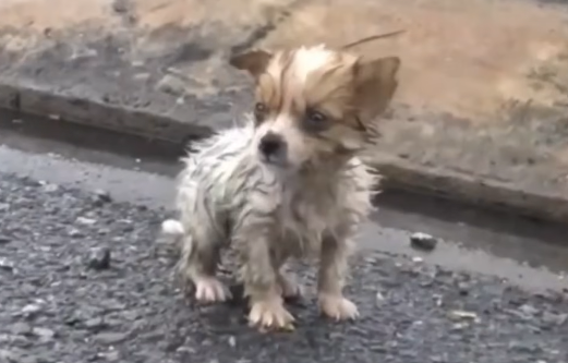 He was small—so small that he looked more like a bundle of fur than a dog. His soft brown coat was already wet from the rain, clinging to his thin body. Every few seconds he let out a soft cry, a trembling whimper that was barely louder than the sound of the falling rain.