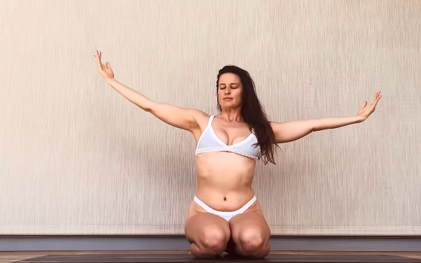 She lifted her arms upward and opened her chest, breathing slowly.
