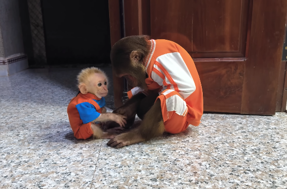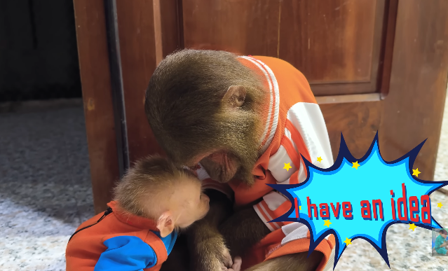 Mom, feeling safe and loved, began to chirp softly and interact with Buem in playful gestures. The baby monkey responded, chirping back and offering gentle touches, all under CUTIS’s watchful eyes. It was a beautiful display of bonding: the older monkey guiding, the baby learning, and the mother feeling cared for during a vulnerable time.