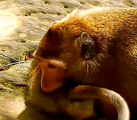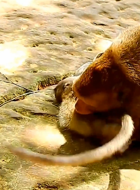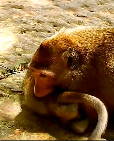 By the time the sun began to set, casting golden light through the treetops, the little monkey rested safely in the arms of its mother, calm and secure once more. The bully had moved on, and the forest settled into a quieter rhythm. But the experience had left a lasting mark—a testament to the strength, courage, and determination of even the smallest among us. It was a story of survival, resilience, and the unbreakable bonds of family, showing that no matter how small or vulnerable one may be, determination and intelligence can overcome fear and danger.