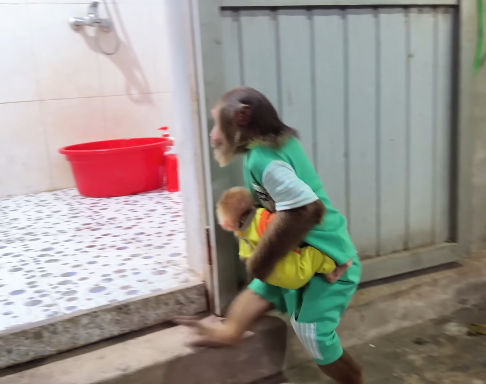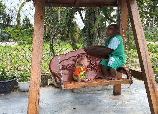 CUTIS smiled, amused and touched by the thoughtful gesture. She nudged her little one gently. “See, the surprise isn’t just fun—it’s Dad showing love. Look at how he arranged everything carefully.” The baby monkey immediately crawled forward, sniffing each fruit, poking the nuts, and trying to pick up the wooden toy, which Dad had shaped like a tiny swinging monkey. CUTIS laughed as the baby attempted to make it swing from a small vine, failing adorably, then trying again with even more determination.