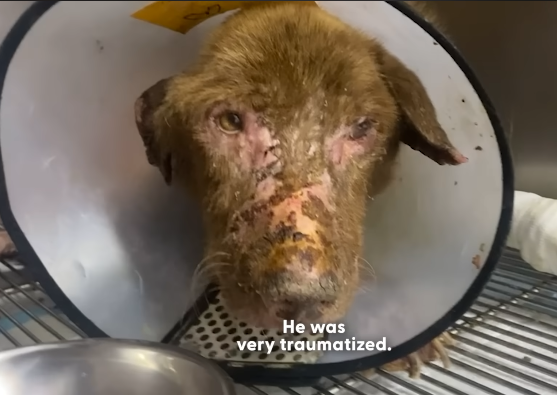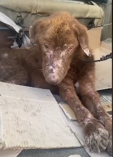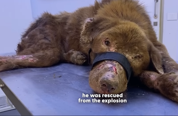 Amid the chaos and rubble, the dog was discovered by rescuers who were shocked by what they saw. His body was badly injured, and parts of his fur were burned or missing. He looked fragile and exhausted, as if he had endured far more pain than any animal should ever experience.