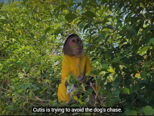 The forest was now a blur of leaves and sunlight as CUTIS navigated branches and uneven ground with skillful precision. The larger monkey and other curious animals could only watch helplessly as the duo disappeared into the greenery. The combination of stealth, speed, and strategy was impressive—like a carefully orchestrated comedy heist.