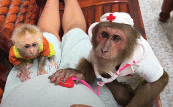 Baby Monkey’s tiny fingers grabbed a bright orange carrot. He looked up at Dad, then at CUTIS, and chirped excitedly. CUTIS barked softly in reply, almost laughing, as if sharing an inside joke with the baby monkey. Dad couldn’t help but chuckle nervously. “CUTIS… what are you trying to do? Are you teaching him something? Or… are you showing me something I don’t understand?”