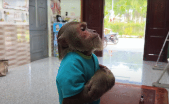 The morning sun filtered softly through the thin curtains, casting a warm glow across the small room. On the bed, little Bibi, the baby monkey, stirred and stretched her arms …