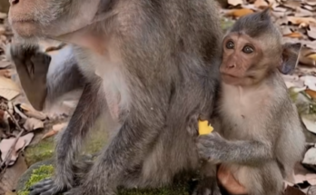 In the heart of a lush forest, where the sunlight filters gently through the leaves, a tiny miracle unfolds every day—a lovely baby monkey nestled in the arms of its …